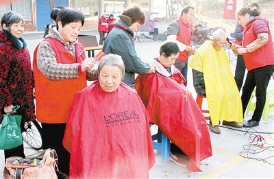 12月5日是第32个国际志愿者日,为进一步弘扬“奉献、友爱、互助、进步”的志愿精神,我市集中开展志愿服务活动。图为昨天上午,召陵区志愿者在市区烟厂花园为市民免费理发。