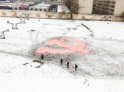 1月7日上午,漯河职业技术学院操场上的一枚党徽图案格外显眼。据了解,这枚党徽图案是该校2017级室内设计专业(1)班10余名党员和入党积极分子,用九宫格放大的方式在雪地里画上方格,然后用绳子画出党徽的轮廓,再用颜料把雪染成红色而成。本报记者 杨 光 摄