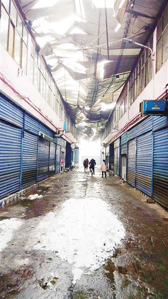 由于天未晴,积雪也未化,一时间又无法把顶棚换掉。源汇区马路街街道领导商量后,又给商户做工作,让他们暂时关门歇业,并且联系人员对该市场的路段进行封闭,禁止通行。