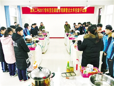 本报讯(记者 刘亚杰)1月4日,漯河二中在东校区烹饪教室举行“2017学年烹饪课教学观摩暨包饺子比赛”。