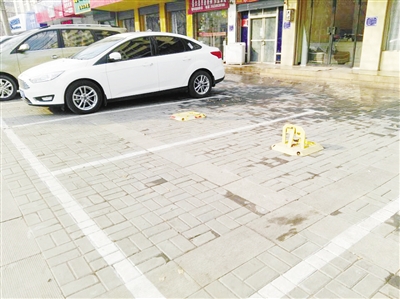 随后,记者来到交通北路与海河路交叉口,看到路口西北角商铺门前的公共停车位,也被装上了黄色的车位锁。
