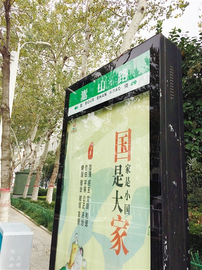 记者首先来到市区嵩山路,看到路边路牌的颜色为绿色,并有南北方向的指示箭头。随后,记者来到市区淮河路,看到路牌的颜色为蓝色,并有东西方向的指示箭头。