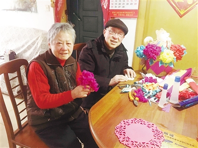 2月10日上午,记者来到余润华家中时,余润华和妻子丁德纯正在一起动手做过年时家里的装饰花。桌子上放着剪刀、胶水、皱纹纸、金粉等材料。