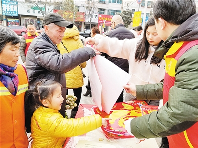 2月9日至11日,市城乡规划局开展“迎新春送对联普法宣传进社区”活动,向市民发放规划法规宣传页并送上免费对联。图为志愿者在源汇区顺河街办事处五一路社区向社区居民发放宣传页和对联。