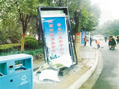 3月19日上午,市区海河路与嵩山路交叉口东北角,一个灯箱广告牌被破坏,地面上散落着玻璃碎片。本报记者 吴艳敏 摄