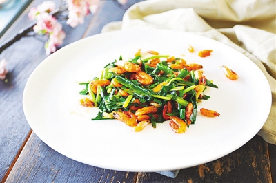 5.待韭菜略软时,倒入河虾大火翻炒,加盐调味即可出锅。