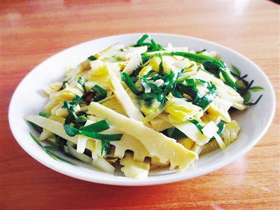 1.韭菜切好,笋先切片,然后切成细丝,入热水锅中焯烫,取出过凉水。
