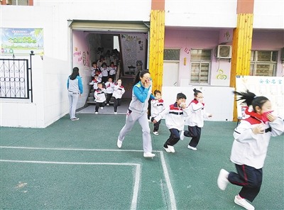 3月26日上午8点多,火灾警报声在郾城区昆仑路小学校园里响起,黄色烟雾从教学楼内飘出,师生们捂住口鼻、弯下腰,只用两分多就有序地撤离到了安全地带。