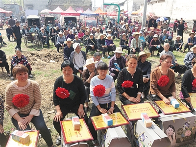 记者在现场看到,村里热闹非凡,在热烈的掌声中,获得“好媳妇”和“五好家庭”的村民胸前戴着大红花,乐呵呵地登上舞台领取荣誉奖牌。