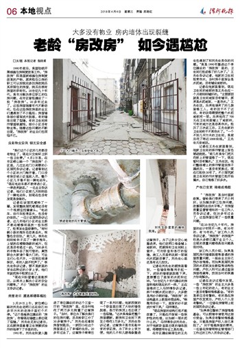1990年前后,我国陆续开展城镇住房制度改革工作,“房改房”即是国家城镇住房制度改革的产物,原来租住公房的职工可以按规定参加房改购买其所居住的房屋,购买后拥有房屋的所有权。20世纪九十年代,我市为解决单位职工的住房问题,在市区曾经建设了一批“房改房”。20多年过去了,这些房屋随着年代不断老化,住在这些房改房里的业主们遭遇到了不少尴尬:房屋墙体部分漆面成片脱落,有的墙体出现了裂缝,有的卫生间排污管道被腐蚀,部分小区没有物业等。随着这些问题的不断出现,“房改房”的业主们也烦恼不已。