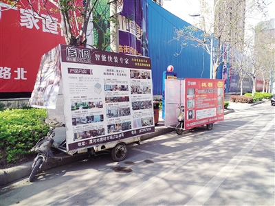 4月9日上午9时许,记者按照刘先生提供的线索,来到市区汉江路与乐山路交叉口附近。记者看到,路口向西约30米的道路南侧有一些停车位,而两辆三轮车一前一后停在车位中。这两辆“广告车”都是由电动三轮车改装而成,车身比较破旧,分别挂着不同商家的广告牌子,上面有一些图片以及地址、电话等信息。