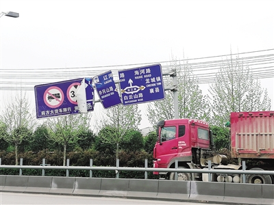 4月11日,在市区白云山路与淞江路交叉口附近,一个交通指示牌损坏严重,需要更换。