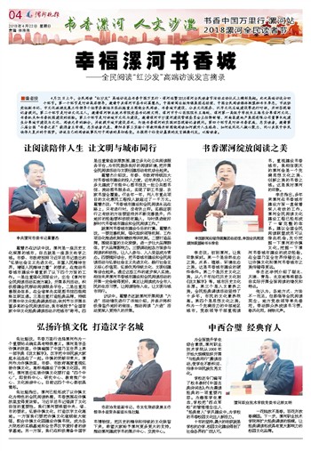 4月21日上午,全民阅读“红沙发”高端访谈在书香中国万里行·漯河站暨2018漯河全民读者节活动启动仪式上精彩亮相。此次高端访谈分四个环节。第一个环节是对话高层领导,邀请中共漯河市委书记蒿慧杰,中国新闻出版传媒集团总经理、中国全民阅读媒体联盟秘书长李忠,市政协党组副书记、市文化旅游发展工作领导小组常务副组长张社魁重点围绕全民阅读、书香城市建设、公共文化服务、汉字文化名城建设等进行对话,并回答现场记者提问。第二个环节是对话文化名人,邀请漯河职业技术学院党委书记顾文明、漯河市中心医院院长王海蛟、漯河第一高级中学校长王海东分享漯河文化、书香机关和书香校园建设的经验。第三个环节是对话城市文化与建设,邀请漯河市沙澧河建设管理委员会主任郭新增、河南昌建地产集团有限公司董事长赵建生分享城市建设与文化、阅读元素的融合,并就提升城市建设层次、打造书香漯河的实践回答现场记者提问。第四个环节是对话书香家庭、忠实读者,邀请第二届全国“书香之家”获得者王学儒,忠实读者代表、舞阳县第三实验小学教师梅丹丽围绕阅读如何提升人生格局、如何成风化人凝心聚力、同心共筑中华民族伟大复兴的中国梦,讲述自己的阅读故事及对于阅读的真切感受。本报将十位受访嘉宾的发言摘要刊发,以飨读者。