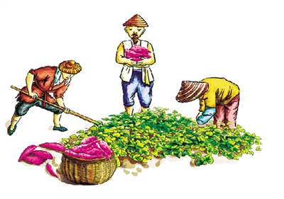 先说栽红薯苗吧,如果碰上阴雨天就省劲多了,用锄头锄一个坑,把红薯苗斜着放进去,再封上土就可以了。如果刚好赶上晴天,那就得把亲戚朋友都叫上,因为还要从井里打水,再一桶一桶地提到地里,每个小坑里倒一瓢水。每次都是父亲和哥哥锄坑、提水,我和弟弟在每个坑里放上一根红薯苗,母亲和亲戚们栽红薯苗封土,两亩地往往要用上一整天才能把红薯苗栽完。