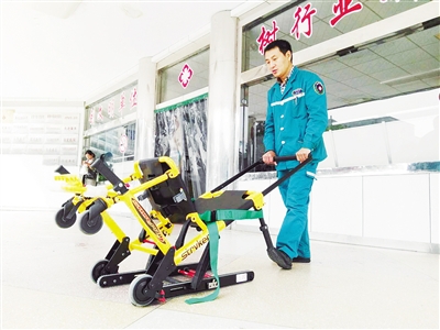 4月24日上午,记者在市区一家医院看到,一种新的120急救设备——“楼梯担架”已经投入使用。这是市120急救指挥中心为弥补普通担架不足而给市区各大医院统一添置的,今后急救人员转运病人下楼将不再难。本报记者 王 辉 摄