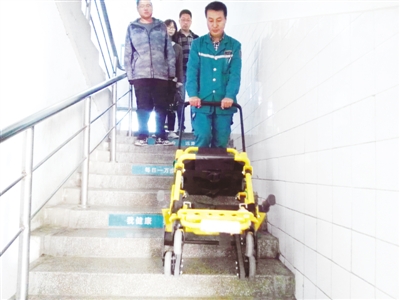 转运完病人后,市第三人民医院急诊科的有关负责人向记者演示了这种“楼梯担架”的功能。