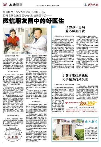 “王医生在俺这十几年了,俺家人跟他都成朋友了。找他看病心里没有压力,有安全感。”4月24日上午,正在等着拿药的孙女士告诉记者,自从关注了王医生的微信朋友圈,学到了很多医学知识。最近,王医生编发的预防手足口病的知识她转发了好多次,就是希望更多人看到。对孙女士的说法,很多在场的居民表示认同,对王宝医生在微信朋友圈发布医学知识称赞不已。