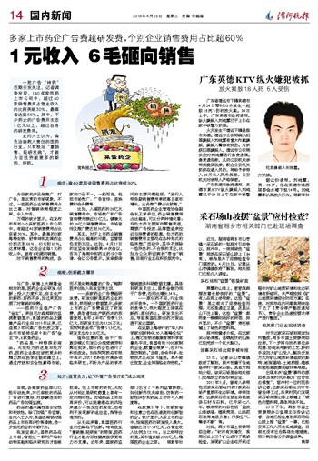——多家药企广告费超研发费。研发创新是医药企业的根本,然而统计数据显示,多家上市药企广告费超过了研发费。典型者如生产眼药水的莎普爱思,去年上半年广告费1.21亿元,而研发支出为1126万元;东阿阿胶去年广告费5.13亿元,研发支出为2.26亿元。