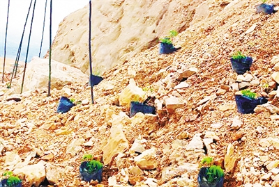 裸露的山体上,密密麻麻摆放着长势良好的“盆景”。有人在网上举报称,这些“盆景”是之前为了迎接检查而摆。无论是通过卫星,还是从山下往上看,这些“盆景”都很像一棵棵刚栽好的树苗。照片显示,不少“盆景”旁还被铺上了绿色的塑料网。