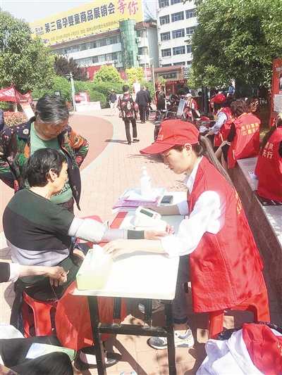 在黄河广场,郾城区妇幼保健院的志愿者在为市民测量血压。