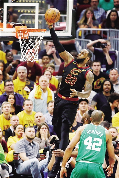 北京时间5月20日,骑士队球员詹姆斯(上)在比赛中上篮。当日,在美职篮季后赛东部决赛第三场比赛中,骑士队以116比86战胜凯尔特人队,但总比分1比2暂时落后。据新华社