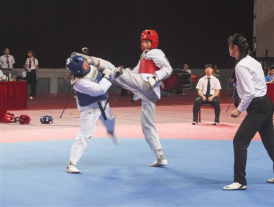 5月21日上午,经过6天比拼,河南省第十三届运动会青少年竞技组跆拳道比赛收官,我市代表队获得3枚金牌、1枚银牌、1枚铜牌。其中杨雪儿获得女子乙组46公斤级第一名,史书源获得女子甲组+67公斤级第一名,李俊起获得男子乙组68公斤级第一名。图为女子甲组+67公斤级第一名史书源(红方)在比赛中。本报记者 杨 光 摄