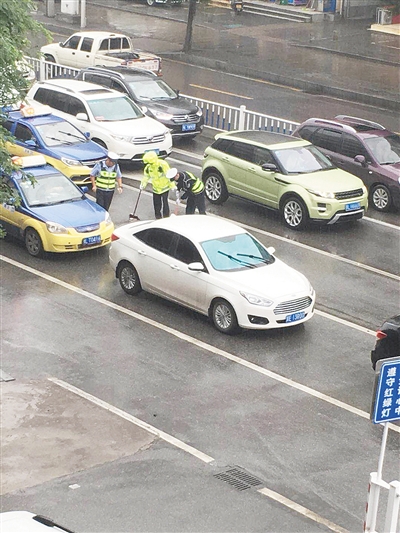 后来,网友“是孙大旺呀”看到,在该路口执勤的三名辅警从附近商铺借来工具,冒雨把玻璃渣清扫干净。“那一会儿下得很大,他们也没打伞,这几名辅警特别棒,作为一名普通市民,我为他们点赞!”网友“是孙大旺呀”说。