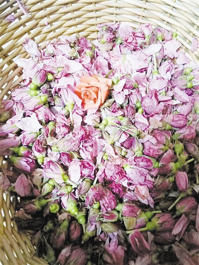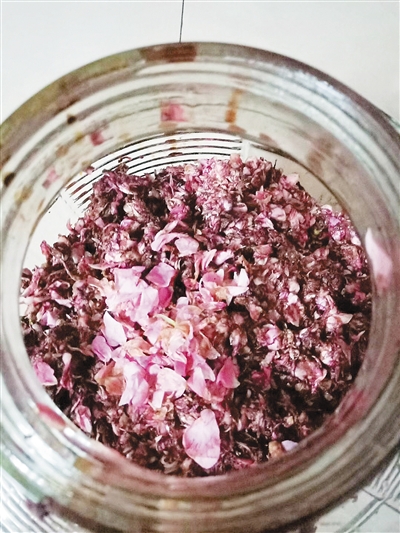 来到潘女士家,潘女士正在晾晒清洗好的玫瑰花瓣。“必须要用可食用的玫瑰花,而且花朵的味道要好于花蕾的味道,不能用花店卖的那种玫瑰。玫瑰花清洗时,要先摘去花托、花蕊,然后倒入装有净水的大盆里转圈漂洗一下,立刻捞取出来;接着,晾干至表面没有水汽,因为腌渍食品最怕生水,否则就会变质。”潘女士告诉记者。