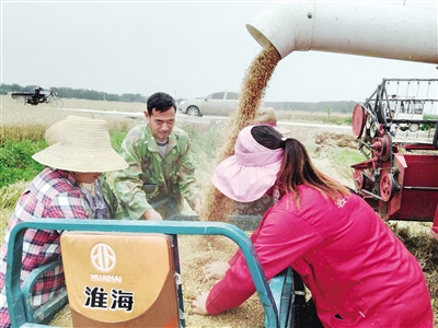 当天上午10点多,记者在郾城区孟庙镇吕庄村颍河岸边的麦田里看到,几台大型联合收割机正在田里来回穿梭,农用三轮车、四轮货车、拖拉机齐上阵,农民们戴着遮阳帽忙碌着。“我们村里的小麦大都在颍河水闸旁边的坡地里,成熟得比较早,前两天就开始收割了。”吕庄村村民吕要民和爱人穿着迷彩服、戴着白手套,等待地里的联合收割机把收割好的麦子卸到三轮车里。