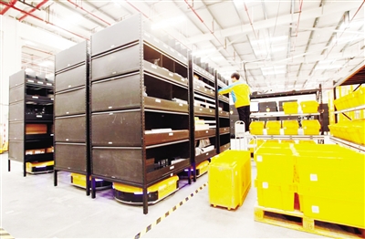 看起来是“放大版”家用扫地机器人的AGV机器人,直径1米、高半米,可以承重800公斤的货品自如行走,轻松“扛”起200个电脑显示器。在这里,商品的拣选不再是人围着货架跑,而是等着机器人驮着货架排队“跑”过来,通过移动机器人搬运货架实现“货到人”拣选。