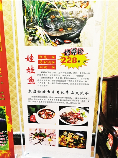 记者看到,这家饭店的广告上写道:“娃娃鱼又称大鲵,是一种集保健、药用、美容为一体的珍贵物种,被专家誉为‘水中人参’‘软黄金’。大鲵肉质细腻、无骨刺、营养价值极高,是一道久负盛名的野味。”