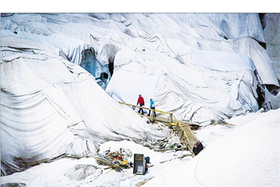 报道称,隆河冰川是瑞士阿尔卑斯山脉中部隆河的源头,为减缓其融化速度,瑞士科学家每年夏季都会用巨大的白色毛毯将其覆盖(如图)。据悉,科学家通过对暴露出来的岩石进行年代检测,证明隆河冰川至少有一万年历史。据新华网
