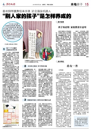 班主任老师刘博告诉记者,崔馥雅的学习成绩在班里一直名列前茅,她能流利地将《论语》《大学》《中庸》《老子》《庄子》《易经》及大量的古诗词背诵出来,她今年小学毕业,能背诵的国学经典内容加起来有10万字左右。“崔馥雅在学校是个大忙人,她一直担任班干部,还参加了学校的合唱团和舞蹈队。”刘博说,不仅学习好,崔馥雅人缘也特别好。这个孩子就是传说中“别人家的孩子”吧,小小年纪能如此优秀,确实难得。