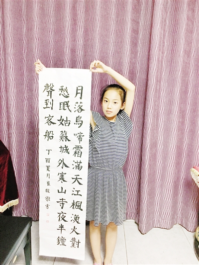 ↑崔馥雅向记者展示自己的书法作品。