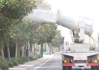8月6日,市园林处一辆喷洒车,在市区嵩山东支路为行道树喷施药物。