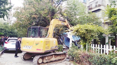 10月20日上午,市城管局、郾城区联合行动,对黄山小区临时构筑物、毁绿占绿设置的围墙栅栏等30多处违法建筑设施进行拆除。本报记者 于文博 摄