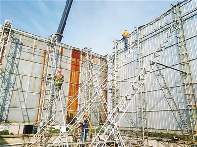 10月19日上午8点半,在市人民会堂西侧,现场拉起了警戒线,一台大型吊车旁边竖着一块“危险,严禁靠近”的提示牌,几名头戴安全帽的施工人员正在