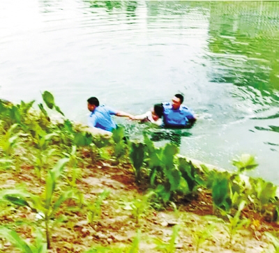 事发的小河河底都是淤泥和砖块,河中间有两米多水深。沈银亮和李金峰赶到现场后,看到女孩已经往河中间漂去,两人连衣服都没脱,就跳入河中救人。李金峰游到女孩后面抓住女孩,而沈银亮则在前面抓住了女孩的手。两人合力将女孩拖至岸边(如图)。