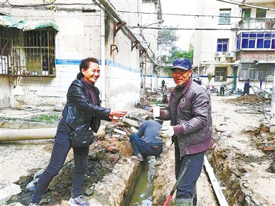 “来,师傅,这是俺新沏好的茉莉花茶,喝口茶,歇会儿吧!”11月1日上午9点多,原银鸽西家属院正在施工的工地上,小区居民陈卫民和杨焕枝站在自家门口,拎着茶壶,给工人师傅们递上茶水。