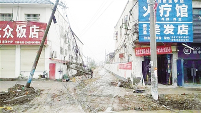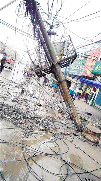 11月8日上午,记者赶到现场时,路边几根线杆严重倾斜,地上散落着一捆捆线缆。