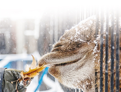 在公园门口,我碰到了杨光,他准备去拍摄动物们在雪天嬉戏的照片,我们结伴而行。在现场,他绕着偌大的公园,看了每一种动物。有的动物住所积雪一尺多厚,一脚踩下去,雪到膝盖。为了找到好的拍摄角度,他在这样深的雪地里一站十几分钟。看到他这么认真的态度,我觉得很惭愧。我们踩着积雪走遍了整个公园,从9点忙到12点才结束采访。其间,他带着我和饲养员及园区管理员聊了很多动物过冬的知识。