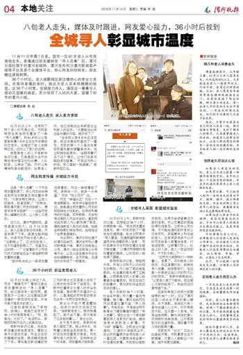 11月11日早晨7点多,我市一位81岁老人从市体育场走失,家属通过朋友圈转发“寻人启事”后,漯河日报社旗下的漯河名城网、漯河发布和沙澧河新闻客户端等平台及多个自媒体平台、热心网友纷纷转发,朋友圈迅速被刷屏。