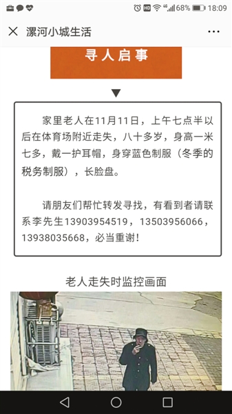 近几日,漯河气温较低,昼夜温差比较大。11月11日晚上,老人还是没有任何消息。天逐渐黑了下来,温度也越来越低,许多网友开始为老人揪心。“这都晚上了,还没找到老人,也不知道走到哪儿了,夜里怎么过的呢……”记者看到不少网友仍然不间断地在各个微信群和朋友圈转发着。