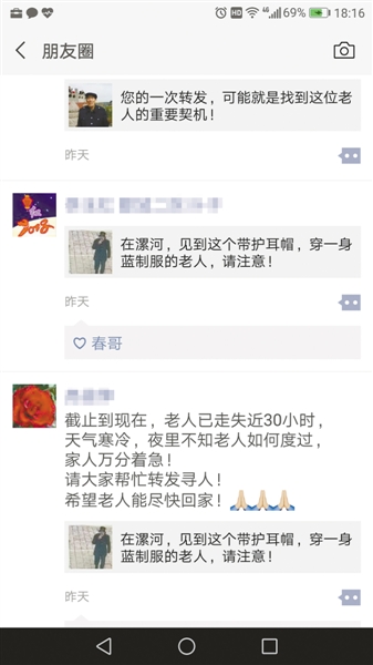 这条“寻人启事”一下子在朋友圈刷屏了,热心网友纷纷转发到所在的群里及朋友圈并寻找:“大家快帮忙转发,让老人别挨冻,赶紧回家。”“求转发,帮助漯河爱心网友找到家人,愿老爷爷早点回家”……这些网友用心编辑的文字,让人揪心又感动。