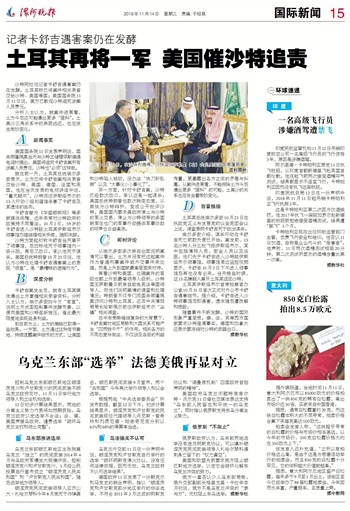沙特阿拉伯记者卡舒吉遇害案仍在发酵。土耳其称已将案件相关录音交给沙特、美国等国;美国国务院11月11日说,美方已敦促沙特追究涉案人员责任。