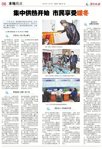记者了解到,从2018年11月15日开始,我市正式向市区企事业单位和居民进行集中供热。首批享受供热的有漯河高中、漯河小学、市民政局、市实验小学、市国税局和烟厂生活区等17个单位和小区,供热时间将持续到2019年3月15日。