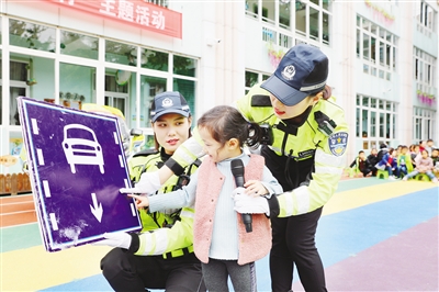 11月14日下午,市公安局交通管理支队女子骑警队来到市实验幼儿园,对幼儿上了一次有趣的交通安全课。