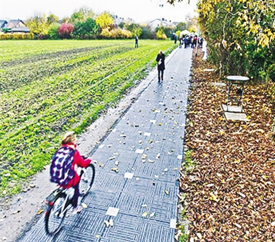 德国首条太阳能自行车道11月12日在西部北威州城市埃夫特施塔特启用。太阳能发电可用于自行车道的照明、监控以及冬季融冰等,多余电力甚至能并入地方电网。
