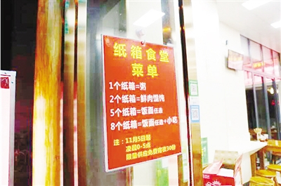 据网友透露,该店老板和那部火热的日本美食剧“深夜食堂”一样,只在深夜开张,不仅精心设计了置换菜单,还特别在店内设置了一个绿色回收台,方便大家集中投递纸箱。有意思的是,不同个数的纸箱还能换取不同的夜宵套餐:1个纸箱换一碗热粥;2个纸箱换一碗鲜肉馄饨;凭5个纸箱可以饭面任选等。为加班夜归的上班族、外卖员、快递小哥、环卫工人等带去了一份温暖。