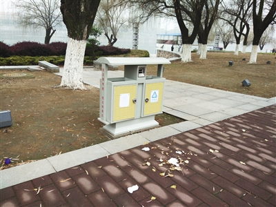 1月14日,在市区泰山路沙河桥附近的沙澧河风景区,一个垃圾桶旁散落着花生皮、卫生纸等垃圾。